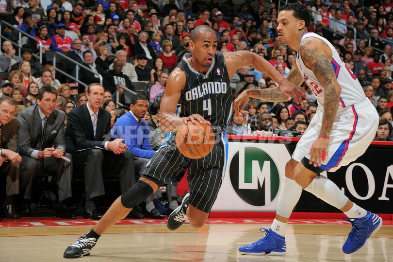 ロサンゼルス・クリッパーズのマット・バーンズ(Matt Barnes、右)にドライブを仕掛けるオーランド・マジックのアーロン・アファラロ(Arron Afflalo、2013年1月12日撮影)。(c)AFP/Getty Images/NBAE/Andrew D. Bernstein