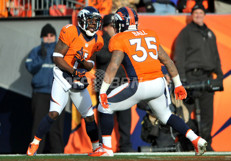 70ヤードのパントリターンタッチダウンを決め、チームメイトのランス・ボール(Lance Ball、右)と喜びを分かち合うデンバー・ブロンコスのトリンドン・ホリデー(Trindon Holliday、2013年1月12日撮影)。(c)AFP/Getty Images/Dustin Bradford