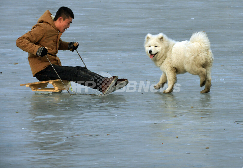 凍てつく北京の冬、結氷した湖面で遊ぶ犬