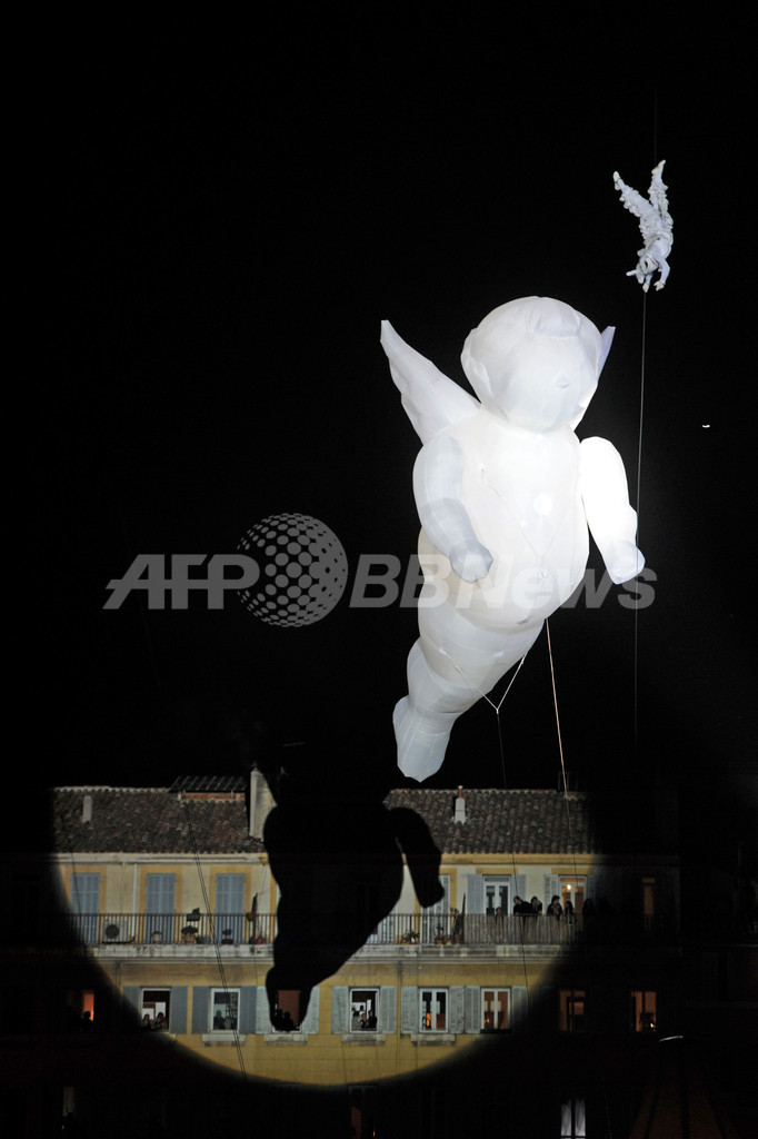 【1月13日 AFP】フランス南部マルセイユ(Marseille)の街頭が12日、真っ白な羽根で埋め尽くされた。これは、サーカス団「ステュディオ・ド・シルク(Studio de Cirque)」が行った街頭パフォーマンス「天使たちの場所(Place des Anges)」。天使に扮した団員が夜空で宙乗りを披露し、巨大な天使のバルーンが登場すると、路上にたくさんの白い羽根が降った。
