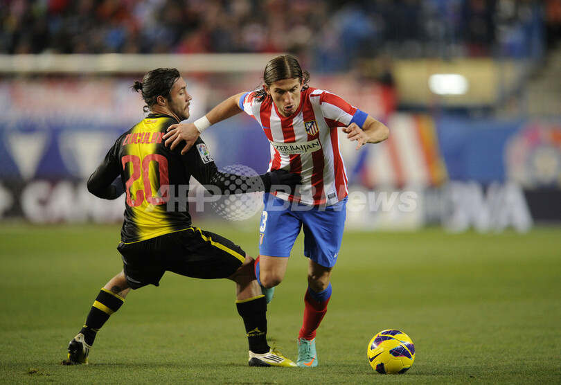 レアル・サラゴサのフランコ・ズクリーニ(Franco Zuculini、右)とボールを競るアトレティコ・マドリードのフィリペ・ルイス・ カスミルスキ(Filipe Luis Kasmirski、2012年1月13日撮影)。(c)AFP/PEDRO ARMESTRE