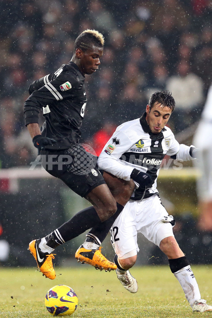 ボールを競るパルマのマルコ・マルキオンニ(Marco Marchionni、右)とユベントスのポール・ポグバ(Paul Pogba、2013年1月13日撮影)。(c)AFP/MAURIZIO PARENTI