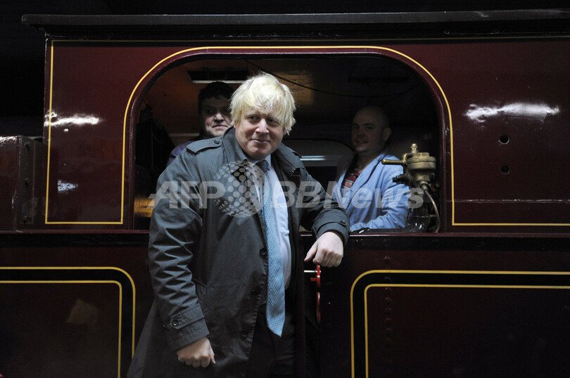 写真は、蒸気機関車に引かれてムーアゲート駅に到着した列車の連結部分でポーズをとるジョンソン市長(2013年1月13日撮影)。(c)AFP/CARL COURT