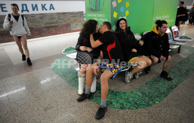 写真は、ブルガリアの首都ソフィア(Sofia)の地下鉄構内のベンチに座る下半身は下着姿の乗客たち(2013年1月13日撮影)。(c)AFP/NIKOLAY DOYCHINOV