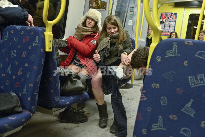 写真は、スウェーデン・ストックホルム(Stockholm)の地下鉄車内でズボンを脱ぐ女性(2013年1月13日撮影)。(c)AFP/SCANPIX SWEDEN/JANERIK HENRIKSSON