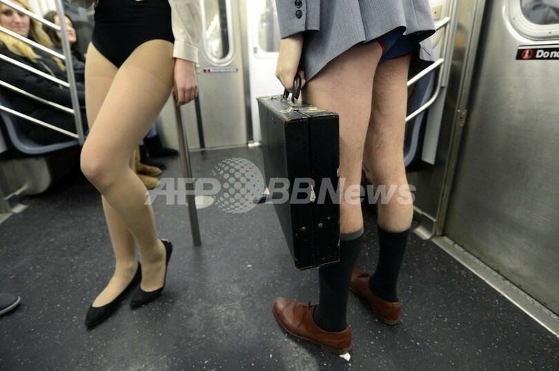 写真は、ニューヨークの地下鉄にズボンをはかずに乗る人(2013年1月13日撮影)。(c)AFP/TIMOTHY A. CLARY
