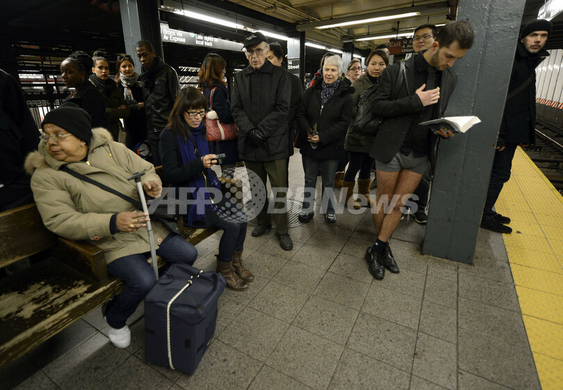 写真は、ズボンをはいていない人もいるニューヨークの地下鉄構内(2013年1月13日撮影)。(c)AFP/TIMOTHY A. CLARY
