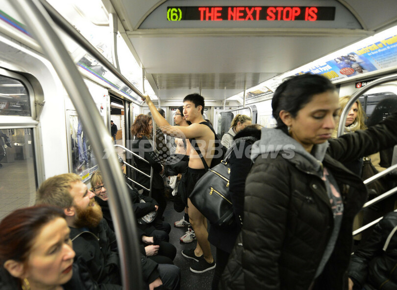 写真は、ズボンやスカートをはかない乗客もいるニューヨークの地下鉄の車内(2013年1月13日撮影)。(c)AFP/TIMOTHY A. CLARY
