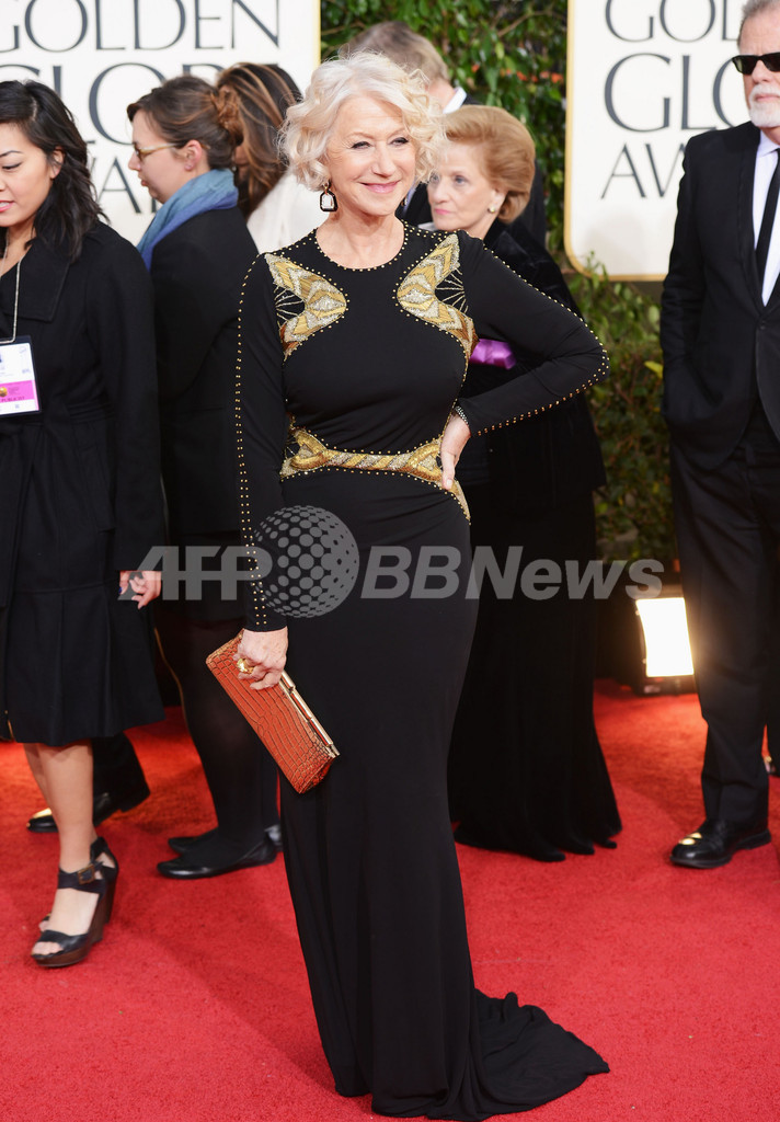 第70回ゴールデン・グローブ賞(Golden Globe Awards)授賞式が13日、米ビバリーヒルズ(Beverly Hills)のビバリー・ヒルトン・ホテル(Beverly Hilton Hotel)で開催された。写真は、レッドカーペットに登場した女優ヘレン・ミレン(Helen Mirren、2013年1月13日撮影)。(c)AFP/Getty Images/Jason Merritt