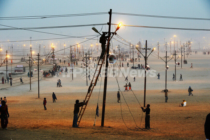 【1月14日 AFP】世界最大の宗教的祝祭とも言われるヒンズー教の祭典「クンブメーラ(Kumbh Mela、「水差しの祭典」の意)」が14日、インドのアラハバード(Allahabad)で始まり、全身に灰をまとった裸体の聖者に導かれ、多数の信者が罪を洗い流そうと、聖なる川、ガンジス(Ganges)川で沐浴(もくよく)を行った。祭典が終わるまでの55日間で、最大1億人の信者が沐浴に訪れるとみられている。