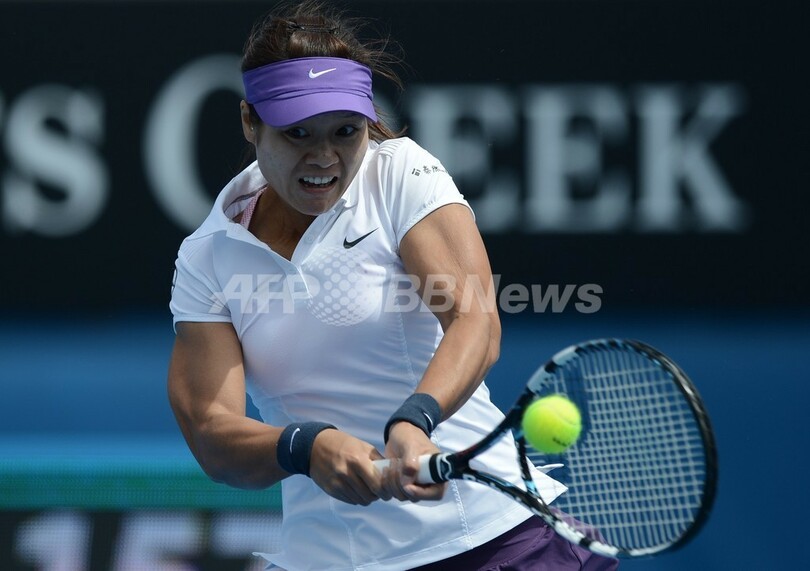 リターンを打つ李娜(2013年1月14日撮影)。(c)AFP/MANAN VATSYAYANA