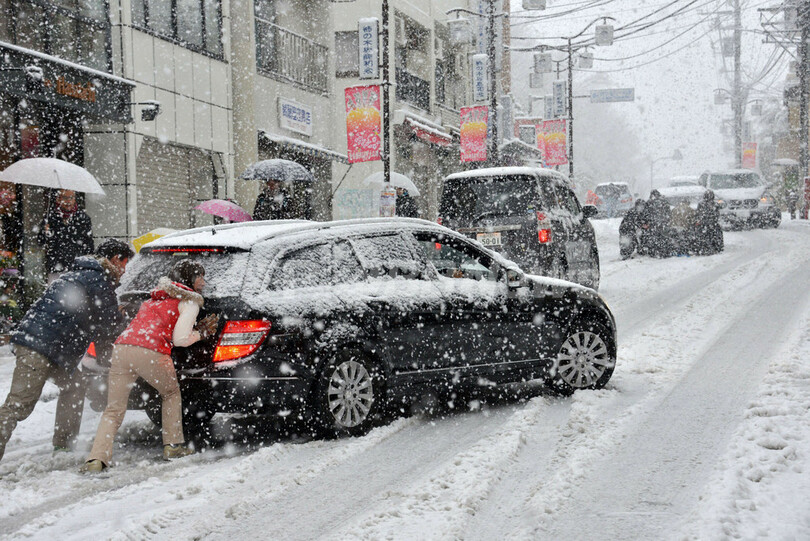 【1月14日 AFP】成人の日の14日、日本の太平洋岸は低気圧の影響で広い範囲で悪天候に見舞われ、初雪となった東京都心でも夕方までに7センチメートルの積雪を観測した。この雪で、飛行機の欠航や鉄道の運休、高速道路の通行止めなど交通への影響が相次いでいる。