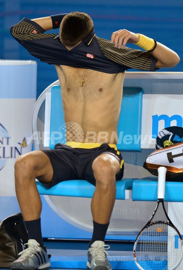 シャツを着替えるノバク・ジョコビッチ(2013年1月16日撮影)。(c)AFP/PAUL CROCK