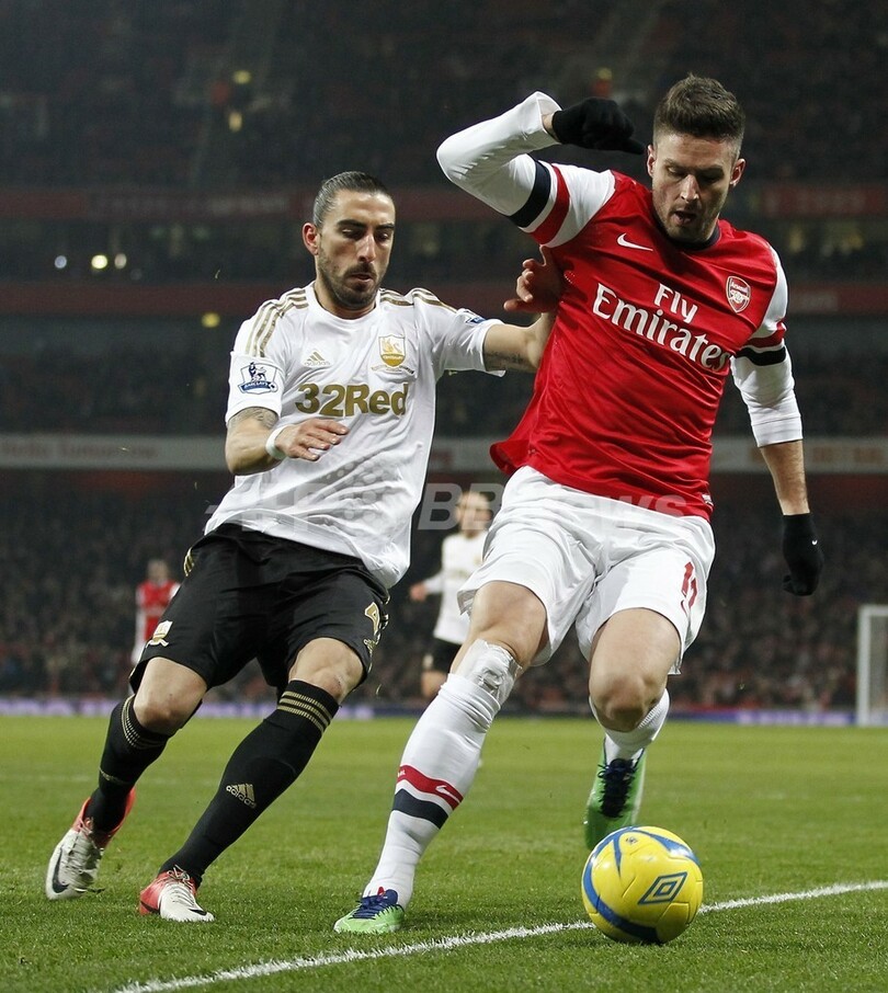 スウォンジーのチコ・フローレス(Chico Flores、右)とボールを競るアーセナルのオリヴィエ・ジルー(Olivier Giroud、2013年1月16日撮影)。(c)AFP/IAN KINGTON