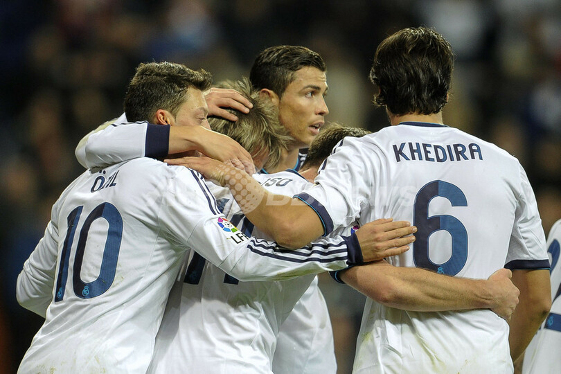 チームの得点に歓喜するレアル・マドリードの選手(2013年1月15日撮影)。(c)AFP/PEDRO ARMESTRE