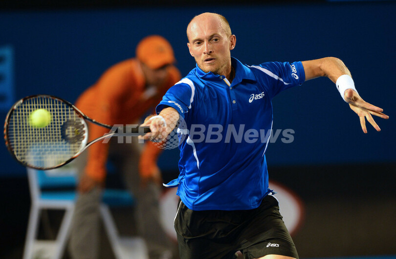 リターンを打つニコライ・ダビデンコ(2013年1月17日撮影)。(c)AFP/WILLIAM WEST