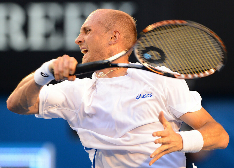 リターンを打つニコライ・ダビデンコ(2013年1月17日撮影)。(c)AFP/WILLIAM WEST