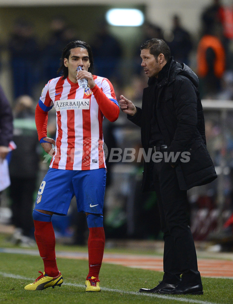 試合中、ディエゴ・シメオネ(Diego Simeone)監督(右)と言葉を交わすアトレティコ・マドリードのラダメル・ファルカオ・ガルシア(Radamel Falcao Garcia、2013年1月17日撮影)。(c)AFP/PIERRE-PHILIPPE MARCOU