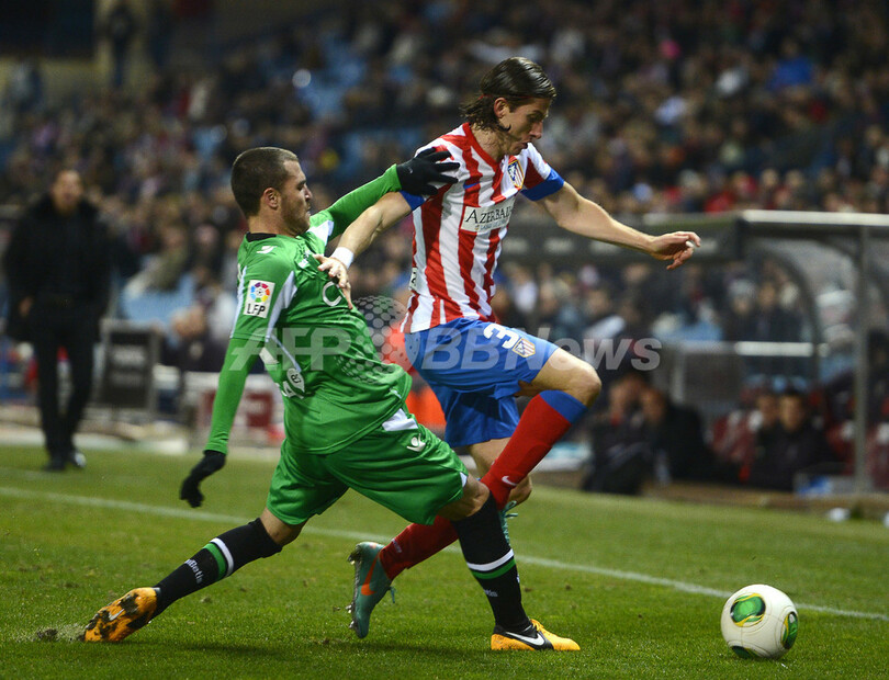 レアル・ベティスのハビエル・チカ(Javier Chica、左)とボールを競るアトレティコ・マドリードのフィリペ・ルイス・カスミルスキ(Filipe Luis Kasmirski、2013年1月17日撮影)。(c)AFP/PIERRE-PHILIPPE MARCOU