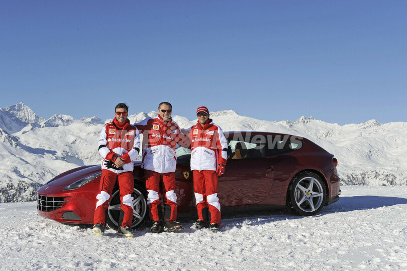 雪上に飾られたフェラーリFFの前でポーズをとるフェラーリの(左から)フェルナンド・アロンソ(Fernando Alonso)、ステファノ・ドメニカーリ(Stefano Domenicali)代表、フェリペ・マッサ(Felipe Massa、2013年1月18日提供)。(c)AFP/WROOOM2013 PHOTO SERVICE