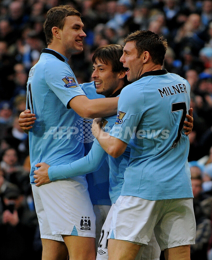 前半2分に先制点を挙げ、チームメイトのエディン・ジェコ(Edin Dzeko、左)とジェイムス・ミルナー(James Milner、右)とともに歓喜するマンチェスター・シティのダビド・シルバ(David Silva、2013年1月19日撮影)。(c)AFP/Andrew YATES