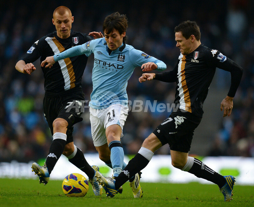 その後、フラムのスティーヴ・シドウェル(Steve Sidwell)にポストをたたくシュートを許し、さらにパブロ・サバレタ(Pablo Zabaleta)の負傷交代を余儀なくされたシティだったが、迎えた後半24分にカルロス・テベス(Carlos Tevez)のパスを受けたシルバが追加点を挙げた。(c)AFP