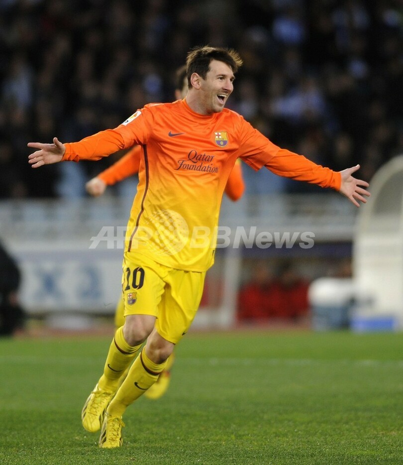 前半7分に先制点を挙げて歓喜するFCバルセロナのリオネル・メッシ(Lionel Messi、2013年1月19日撮影)。(c)AFP/ANDER GILLENEA