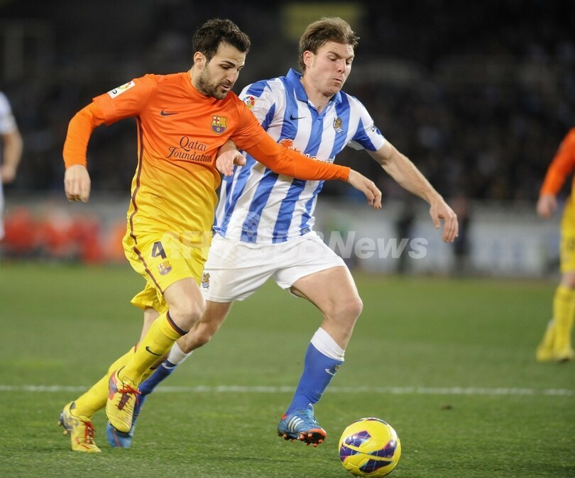 レアル・ソシエダのアシエル・イジャラメンディ(Asier Illarramendi、右)とボールを競るFCバルセロナのセスク・ファブレガス(Cesc Fabregas、2013年1月19日撮影)。(c)AFP/ANDER GILLENEA