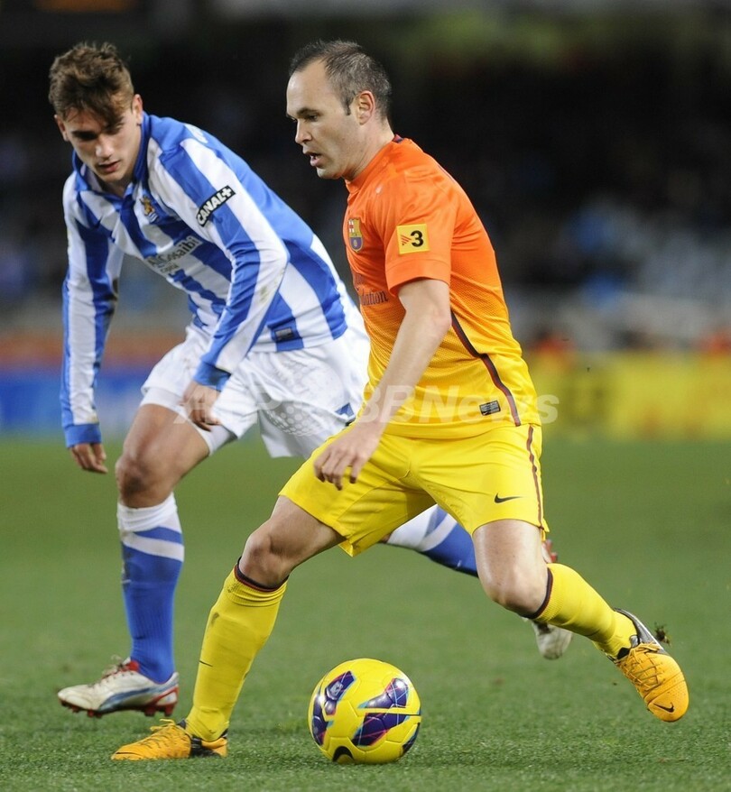 レアル・ソシエダのアントワーヌ・グリエスマン(Antoine Griezmann、奥)のチェックを受けながらもボールをキープするFCバルセロナのアンドレス・イニエスタ(Andres Iniesta、2013年1月19日撮影)。(c)AFP/RAFA RIVAS