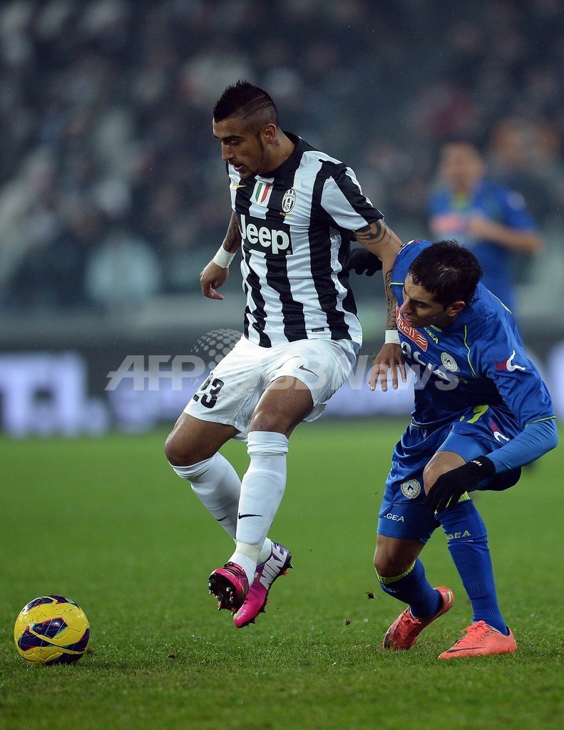 ウディネーゼのロベルト・ペレイラ(Roberto Maximiliano Pereyra、右)とボールを競るユベントスのアルトゥーロ・ビダル(Arturo Vidal、2013年1月19日撮影)。(c)AFP/FILIPPO MONTEFORTE
