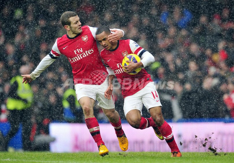 後半13分に得点を挙げ、チームメイトのジャック・ウィルシャー(Jack Wilshere、左)に祝福されるアーセナルのテオ・ウォルコット(Theo Walcott、2013年1月20日撮影)。(c)AFP/GLYN KIRK