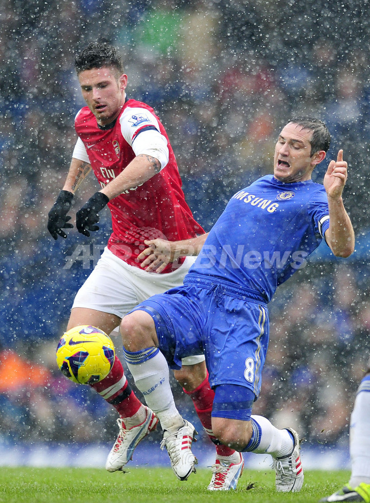 ボールを競るアーセナルのオリヴィエ・ジルー(Olivier Giroud、左)とチェルシーのフランク・ランパード(Frank Lampard、2013年1月20日撮影)。(c)AFP/GLYN KIRK