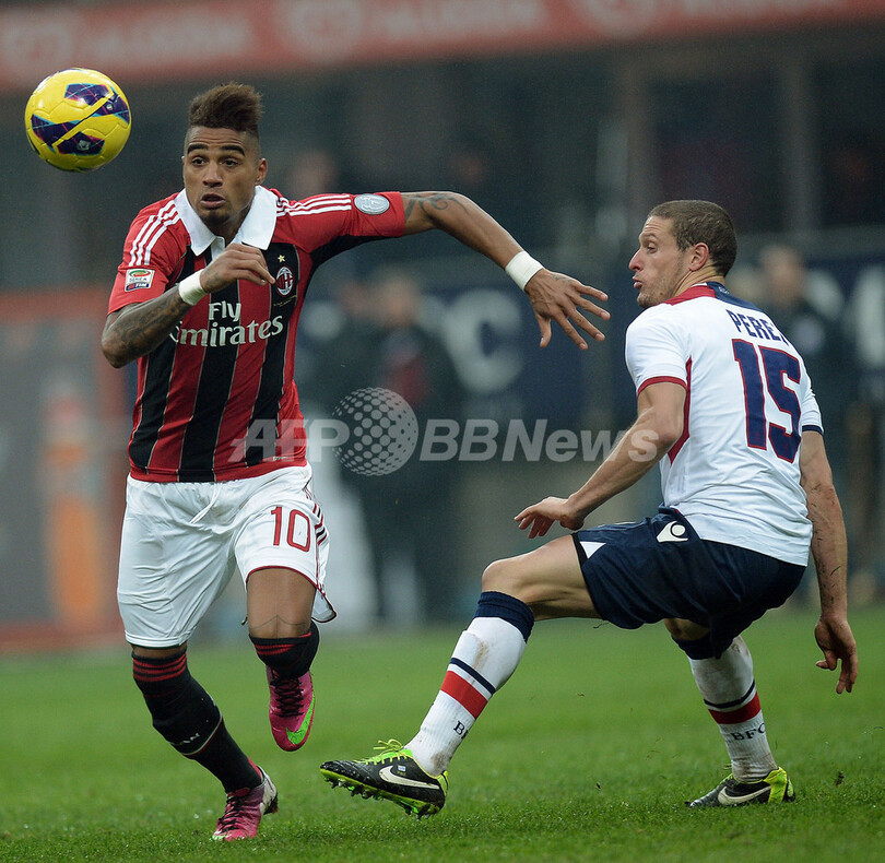 ボローニャのディエゴ・ペレス(Diego Perez、右)をかわしてボールを追うACミランのケヴィン・プリンス・ボアテング(Kevin Prince Boateng、2013年1月20日撮影)。(c)AFP/FILIPPO MONTEFORTE