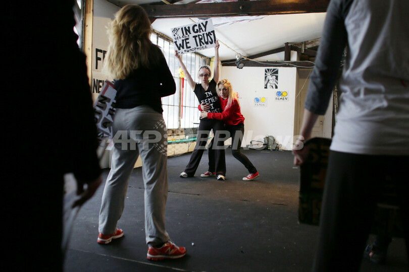 ウクライナの女性権利団体「FEMEN」のメンバーらが、パリ市内の劇場を改装した「ラボワール・モダン・パリジャン(Lavoir Modern Parisien)」にある拠点で、トレーニングや抗議活動の練習を行った。FEMENは欧州からロシアまでの各地で、様々な抗議活動をトップレスで行うことで知られている(2013年1月19日撮影)。(c)AFP/KENZO TRIBOUILLARD