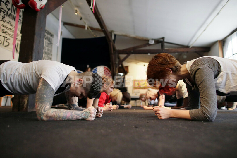 【1月20日 AFP】ウクライナの女性権利団体「FEMEN」のメンバーらが19日、パリ市内の劇場を改装した「ラボワール・モダン・パリジャン(Lavoir Modern Parisien)」にある拠点で、トレーニングや抗議活動の練習を行った。FEMENは欧州からロシアまでの各地で、様々な抗議活動をトップレスで行うことで知られている。(c)AFP
