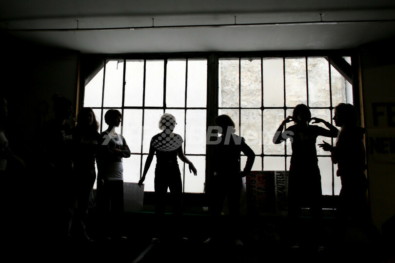 ウクライナの女性権利団体「FEMEN」のメンバーらが、パリ市内の劇場を改装した「ラボワール・モダン・パリジャン(Lavoir Modern Parisien)」にある拠点で、トレーニングや抗議活動の練習を行った。FEMENは欧州からロシアまでの各地で、様々な抗議活動をトップレスで行うことで知られている(2013年1月19日撮影)。(c)AFP/KENZO TRIBOUILLARD