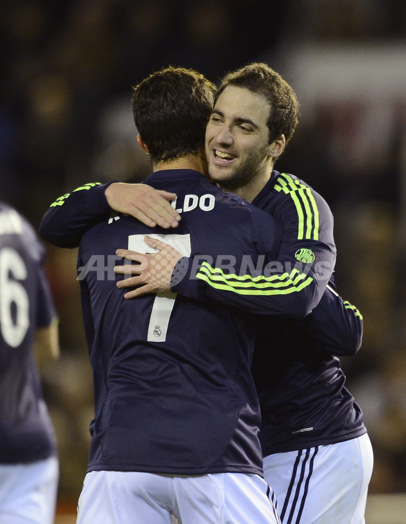 得点を挙げたチームメイトのクリスティアーノ・ロナウド(Cristiano Ronaldo、手前)を祝福するレアル・マドリードのゴンザロ・イグアイン(Gonzalo Higuain、2013年1月20日撮影)。(c)AFP/PIERRE-PHILIPPE MARCOU