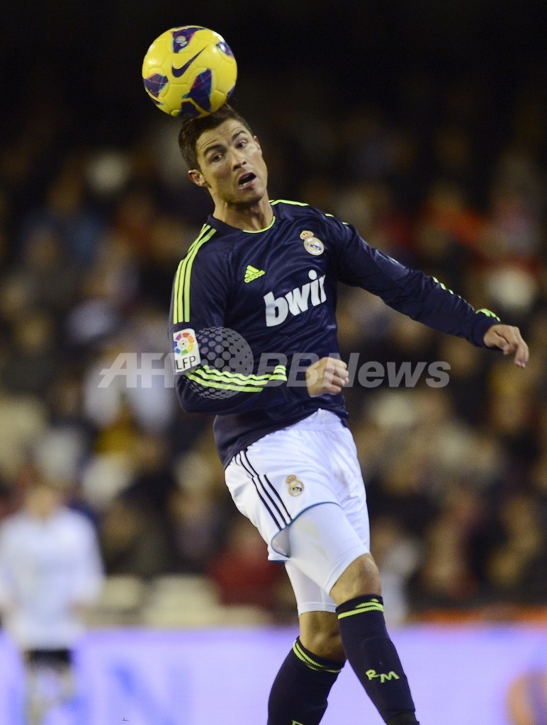 ボールをヘディングするレアル・マドリードのクリスティアーノ・ロナウド(Cristiano Ronaldo、2013年1月20日撮影)。(c)AFP/PIERRE-PHILIPPE MARCOU