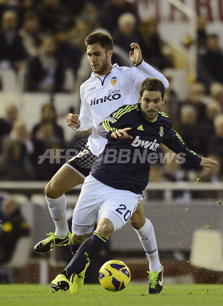 ボールを競るバレンシアのビクトル・ルイス(Victor Ruiz、奥)とレアル・マドリードのゴンザロ・イグアイン(Gonzalo Higuain、2013年1月20日撮影)。(c)AFP/PIERRE-PHILIPPE MARCOU