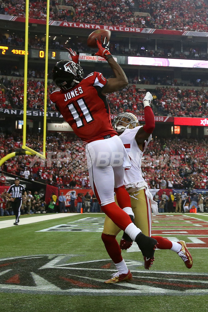 タッチダウンレシーブを決めるアトランタ・ファルコンズのジュリオ・ジョーンズ(Julio Jones、手前、2013年1月20日撮影)。(c)AFP/Getty Images/Chris Graythen