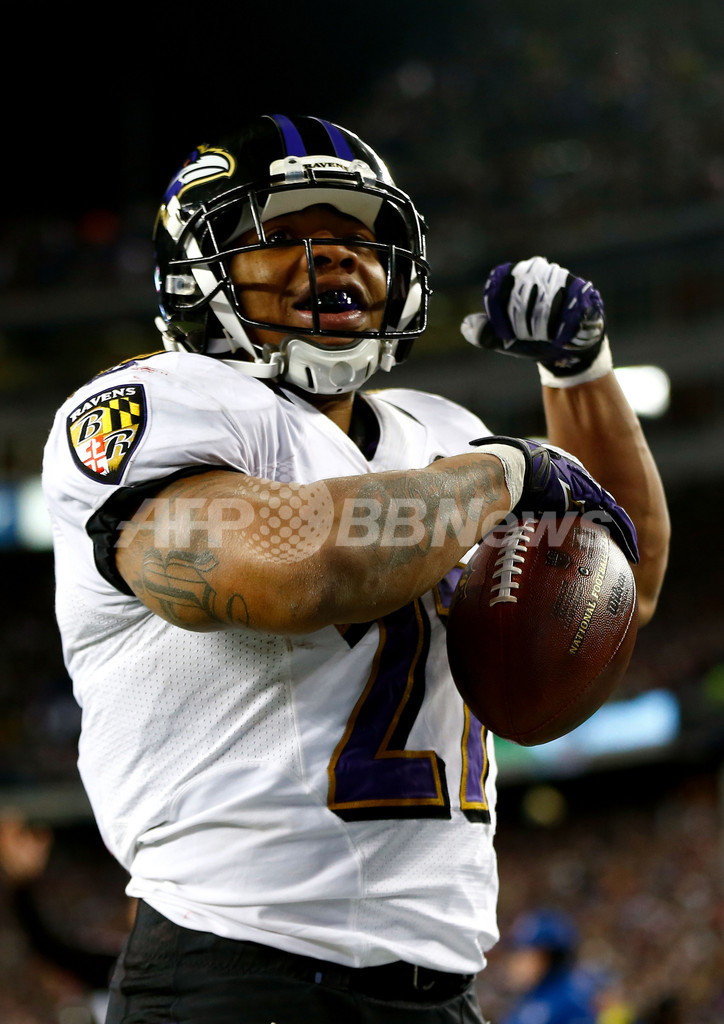 タッチダウンを決めて喜ぶボルティモア・レイヴンズのレイ・ライス(Ray Rice、2013年1月20日撮影)。(c)AFP/Getty Images/Jared Wickerham