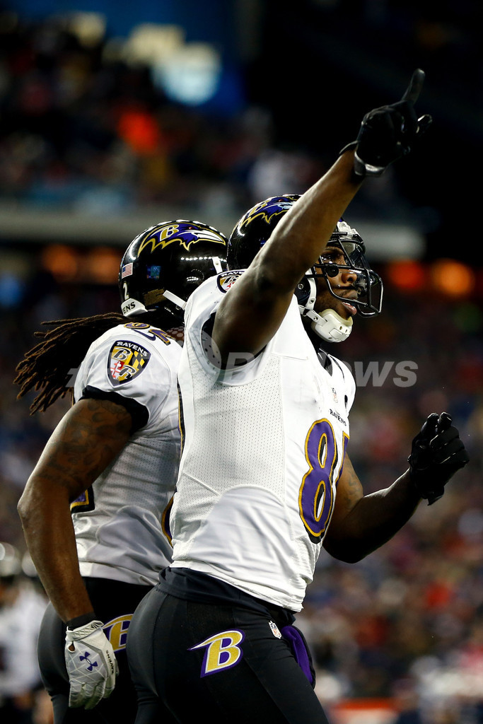 タッチダウンパスをレシーブして喜ぶボルティモア・レイヴンズのアンクワン・ボウルディン(Anquan Boldin、2013年1月20日撮影)。(c)AFP/Getty Images/Jared Wickerham