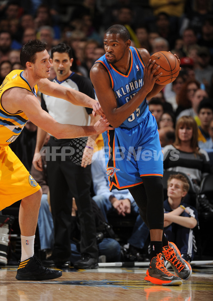 デンバー・ナゲッツのダニロ・ガリナーリ(Danilo Gallinari、左)とマッチアップするオクラホマシティ・サンダーのデビン・デュラント(Kevin Durant、右、2013年1月20日撮影)。(c)AFP/Getty Images/NBAE/Garrett W. Ellwood