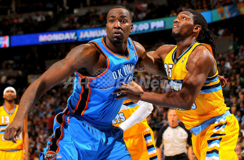 リバウンドを取る位置を争うオクラホマシティ・サンダーのケンドリック・パーキンス(Kendrick Perkins、左)とデンバー・ナゲッツのケネス・フェリード(Kenneth Faried、2013年1月20日撮影)。(c)AFP/Getty Images/NBAE/Doug Pensinger