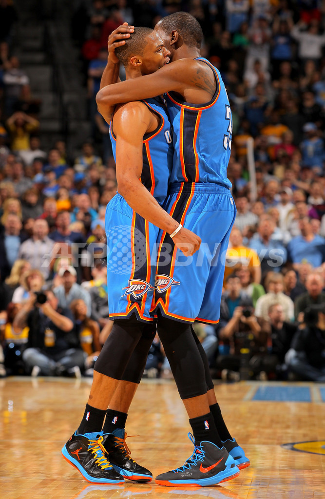 抱擁を交わすオクラホマシティ・サンダーのラッセル・ウエストブルック(Russell Westbrook、左)とケビン・デュラント(Kevin Durant、2013年1月20日撮影)。(c)AFP/Getty Images/NBAE/Doug Pensinger