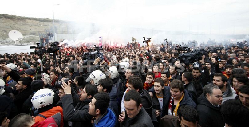 空港でウェズレイ・スナイデルのトルコ入りを待つガラタサライのサポーター(2013年1月21日撮影)。(c)AFP