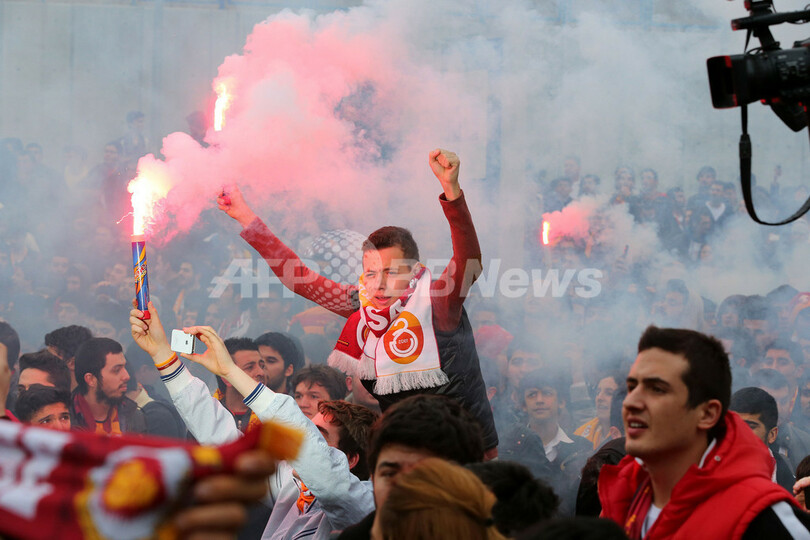 空港でウェズレイ・スナイデルのトルコ入りを待つガラタサライのサポーター(2013年1月21日撮影)。(c)AFP