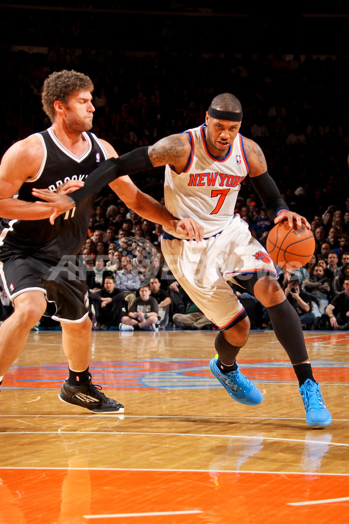 ブルックリン・ネッツのブルック・ロペス(Brook Lopez、左)にドライブをしかけるニューヨーク・ニックスのカーメロ・アンソニー(Carmelo Anthony、2013年1月21日撮影)。(c)AFP/Getty Images/NBAE/Nathaniel S. Butler