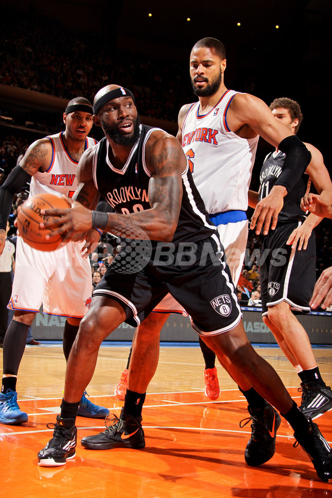 ニューヨーク・ニックスのタイソン・チャンドラー(Tyson Chandler、手前右)とマッチアップするブルックリン・ネッツのレジー・エバンス(Reggie Evans、2013年1月21日撮影)。(c)AFP/Getty Images/NBAE/Nathaniel S. Butler
