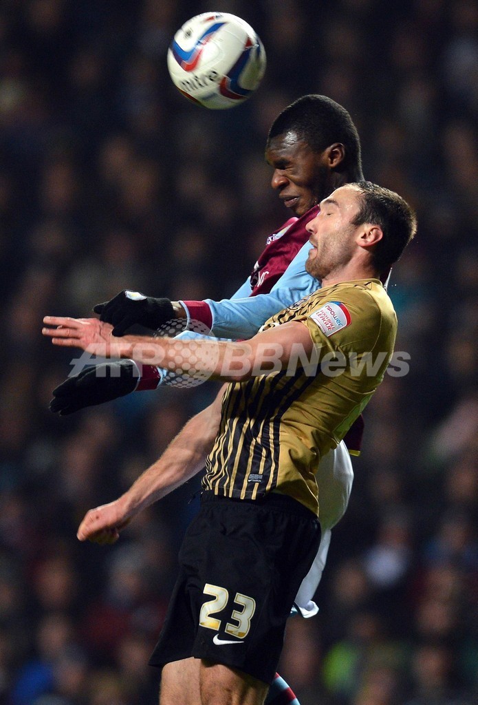 ブラッドフォード・シティのロリー・マカードル(Rory McArdle、前)とボールを競るアストン・ビラのクリスティアン・ベンテケ(Christian Benteke、2013年1月22日撮影)。(c)AFP/ANDREW YATES